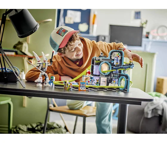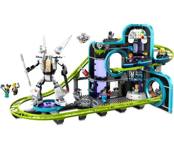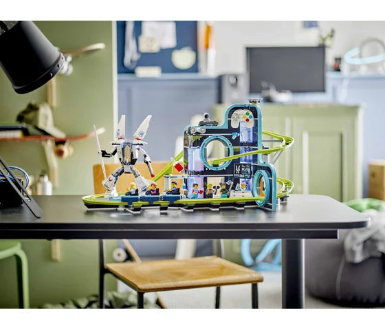- Bouwspeelgoed boordevol details voor fantasierijk speelplezier – een werkende achtbaantrein met 3 karretjes, een verstelbare mecha met een zitplaats voor een minifiguur en videogameconsoles