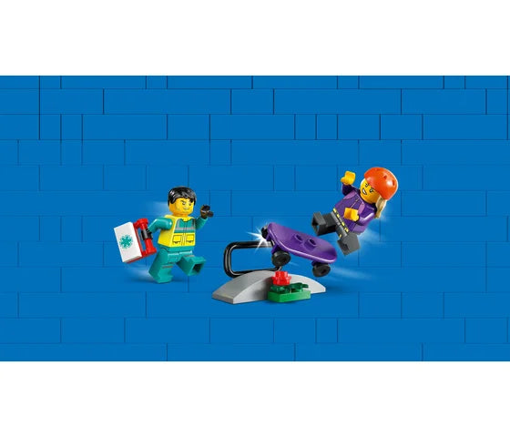 - Wat zit er in de doos? – alles wat kinderen nodig hebben om een speelgoedambulance te bouwen, plus een skatehelling en minifiguren van een skateboarder en verpleegkundige voor rollenspellen
