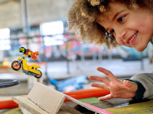 Wat zit er in de doos? Alles wat kinderen nodig hebben om een geweldige stuntmotor te bouwen, plus een minifiguur van de durfal Wallop uit de tv-serie LEGO® City Adventures.