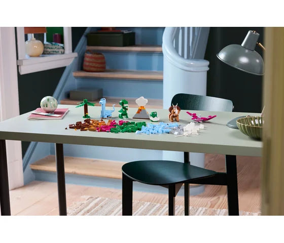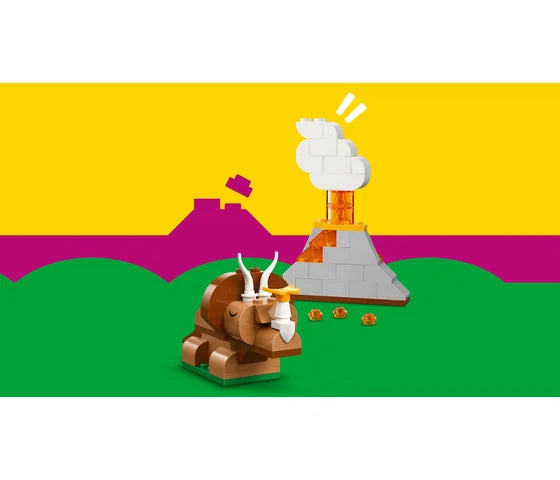 De snel te bouwen LEGO dinosaurussen omvatten een T. rex, Pterosaurus, Triceratops, Brontosaurus en een baby T. rex in een ei, plus een vulkaan, palmboom en accessoires voor fantasierijke verhalen. Naast diverse kleurrijke stenen bevat de set ook speciale elementen, waaronder ogen en monden om de dino's verschillende gezichtsuitdrukkingen te geven. Het creatieve plezier gaat verder als kinderen de stenen combineren om hun wezens aan te passen. Naarmate ze meer vertrouwen krijgen in hun bouwvaardigheden, kunnen ze de intuïtieve bouwhandleiding volgen om hun eigen fantasierijke dino's te maken.