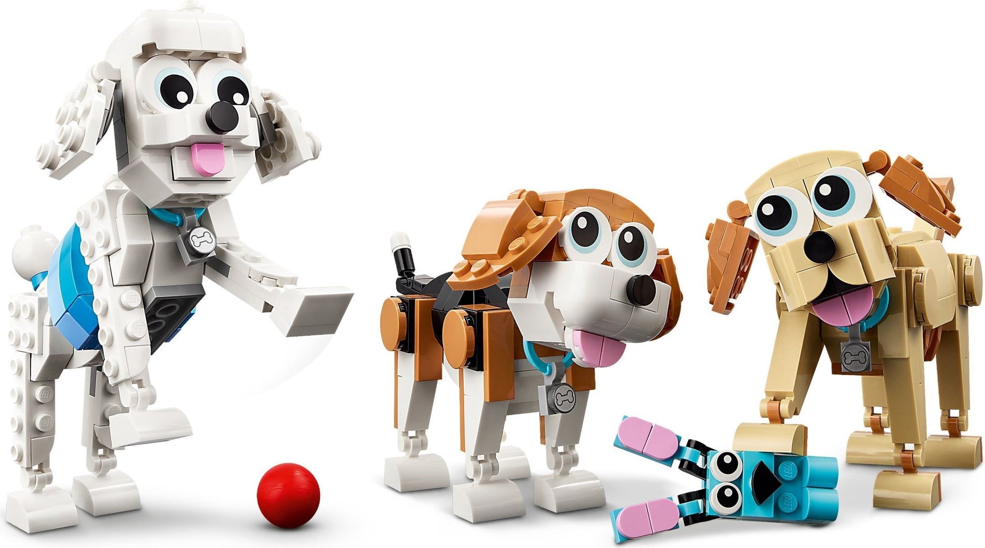 Een hele serie speelgoedhonden – hondenliefhebbers kunnen 3 verschillende groepjes bouwen en met de hondjes spelen: een beagle, een poedel en een labrador, een schnauzer en een mopshond of een husky en een langharige teckel