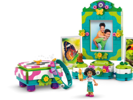 Spreek Disney fans van 6 jaar en ouder aan met dit creatieve LEGO® ǀ Disney Encanto Mirabels fotolijstje en sieradendoos (43239) bouwspeelgoed. De set bestaat uit een juwelendoosje met ruimte voor de meegeleverde armband, plus een fotolijstje en standaard met extra clips voor kleine foto's en 2 plekken voor het Mirabel LEGO ǀ Disney minipoppetje en de LEGO ǀ Disney capibarafiguur.