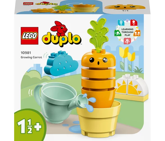 • Stapels plezier – de LEGO® DUPLO® Mijn eerste groeiende wortel (10981) speelgoedset leert peuters vanaf 18 maanden wat duurzaam leven is en hoe planten groeien terwijl ze hun motorische vaardigheden verbeteren