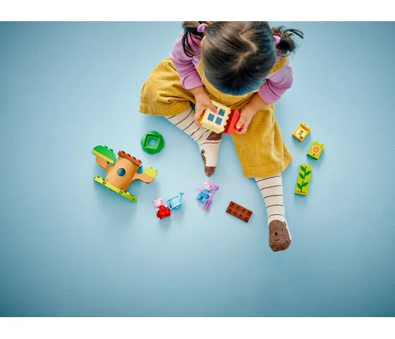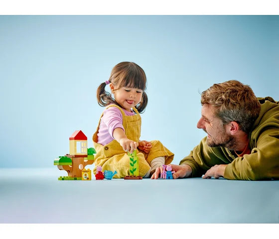 Moedig peuters vanaf 2 jaar aan om het buitenleven te ontdekken met de LEGO® DUPLO® Peppa Big tuin en boomhut (10431) set. Dit leuke speelgoed stimuleert de liefde voor de natuur wanneer kinderen een dagje in de tuin werken en Peppa en George helpen een zonnebloem te kweken.