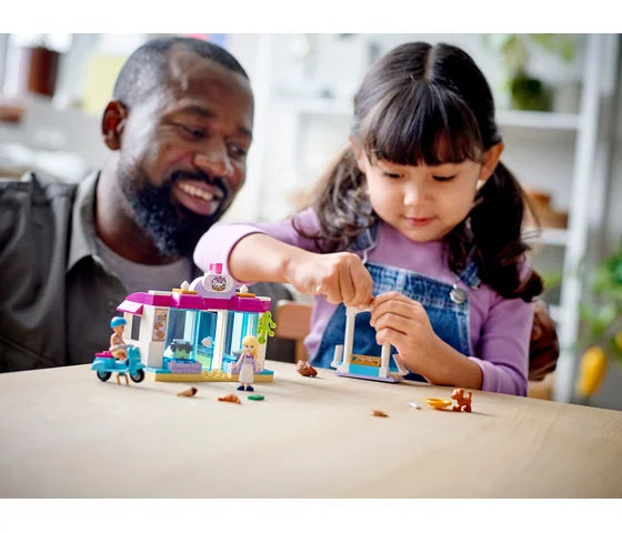 - De compacte Heartlake City bakkerij (41440) helpt kinderen om te leren bouwen, waarna ze allerlei avonturen beleven door te werken in het café, taarten te bezorgen op een coole scooter en te chillen met hun vriendinnen.