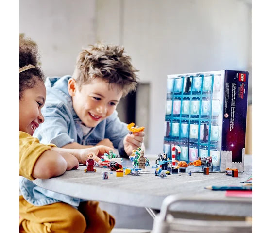 Achter elk van de 24 vakjes van deze kalender vinden kinderen elke dag een cadeautje in aanloop naar Kerstmis. Er zijn 6 minifiguren, waaronder Star-Lord, Rocket, Groot en Mantis, plus minimodellen en accessoires die kinderen zullen herkennen uit het Marvel Cinematic Universe en de Disney+ tv-series. De kalender bevat een drone, een blaster, het ruimteschip van de Guardians, een sneeuwpop met het pantser van Thanos en meer. Naarmate kerst dichterbij komt, kunnen kinderen de cadeautjes combineren voor eindeloze fantasierijke superheldenavonturen.
