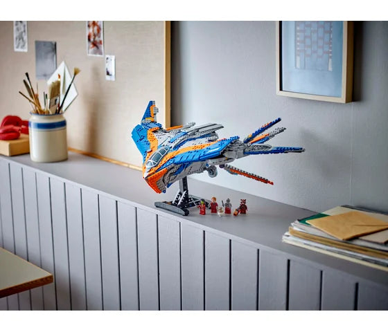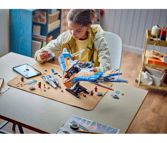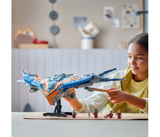 Dit bouwspeelgoed is gebaseerd op het ruimteschip uit de eerste Guardians of the Galaxy film en heeft 6 verstelbare vleugels en 4 beweegbare boosters aan de achterkant. De bovenkant van het model is afneembaar en binnenin vind je een gedetailleerd interieur met 3 verschillende ruimtes: een cockpit met ruimte voor 3 minifiguren, een gemeenschappelijke ruimte met een extra stoel en opslagruimte voor wapens en een rustruimte met een bed en cassetterecorder (een belangrijk element in de films). Er zijn minifiguren van Star-Lord, Gamora, Drax en Rocket, plus een figuur van Baby Groot. Je kunt het ruimteschip neerzetten op de standaard. En met de LEGO Builder app kunnen kinderen inzoomen en modellen in 3D draaien terwijl ze bouwen.