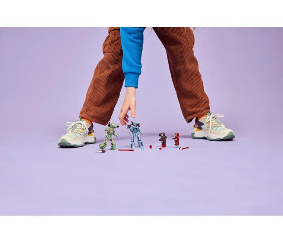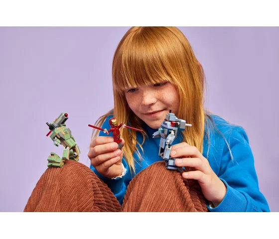 - LEGO® ǀ Marvel minifiguren – inclusief een Iron Man minifiguur met blauwe blasters aan zijn handen en voeten en laserwapens, plus een War Machine minifiguur met rode blasters aan zijn handen en voeten en een noppenschieter