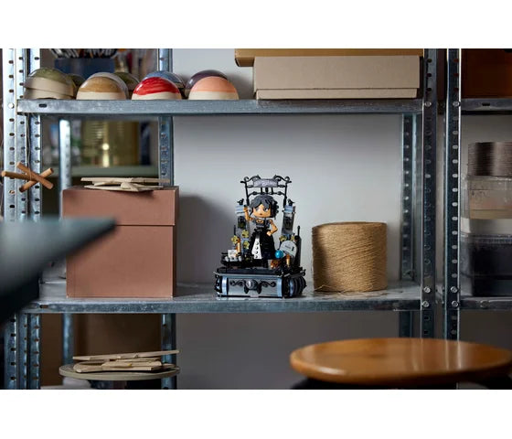 • Wednesday verzamelset – een aanpasbaar model om zelf te bouwen, gemaakt om in verschillende houdingen mee te spelen en neer te zetten, met veel herkenbare voorwerpen uit de populaire tv-serie