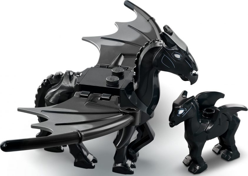 Bouwen, spelen en neerzetten – het rijtuig met de volwassen Thestralis (met ingeklapte vleugels) is ca. 9 cm hoog, 17 cm lang en 6 cm breed