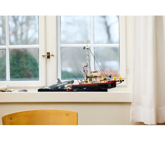 • LEGO® boot en bouwbare zeewaterbasis – het model van de boot Orca heeft een cabine met een afneembaar dak zodat je de details van het interieur goed kunt bekijken, een verstelbare giek en tuigage en diverse accessoires