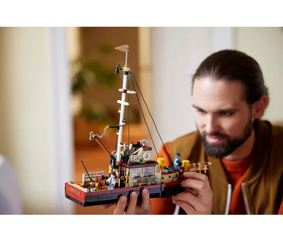 Denk terug aan dramatische filmmomenten met de LEGO® Ideas Jaws dioramaset voor volwassenen (21350). Deze set is een leuk cadeau voor fans van Jaws, liefhebbers van klassieke films of verzamelaars. Er is een LEGO model van de boot Orca met een gedetailleerde cabine en een afneembaar dak, een verstelbare giek en tuigage, plus diverse accessoires. Het model kan op een bouwbare zeewaterbasis worden geplaatst met de LEGO haai dat de boot aanvalt. Bevestig een bedrukte tegel met de beroemde zin van politiechef Brody ("You're gonna need a bigger boat") aan de basis om de blikvanger helemaal af te maken.