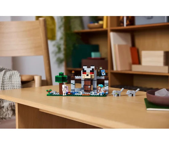 Kinderen bouwen een basis voor de wolventemmer met een grote wolvenkop boven de ingang. Ze kunnen het gezicht van de wolf van vriendelijk naar boos veranderen. Binnen vind je een werkbank, een smeltoven, een aambeeld en, voor het eerst in een LEGO Minecraft set, een smeedtafel. Een kist met spullen bevat een Netherieten staaf waar kinderen een zwaard van kunnen maken, zoete bessen en botten om de wilde wolf te temmen. Buiten is een bosgedeelte met een boom, rotsblok, paddenstoel en zoetebessenstruik. 2 Minecraft skeletten dwalen door het bos: de ene heeft een betoverde boog, de andere een pijl en boog en een diamanten helm. Voor nog meer digitaal plezier kunnen bouwers de intuïtieve LEGO Builder app gebruiken.