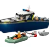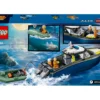- Wat zit er in de doos? – alles wat kinderen nodig hebben om een politieboot en rubberboot van een boef te bouwen, plus minifiguren van 2 politieagenten en een boef en een figuur van een haai