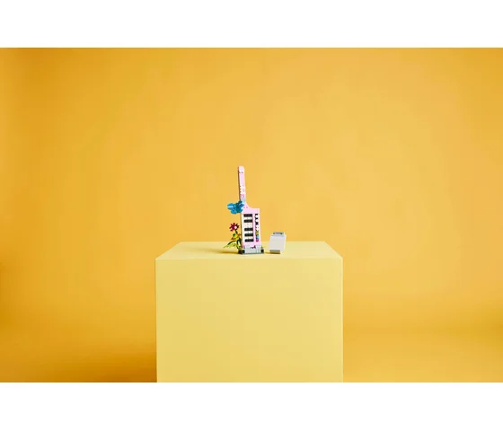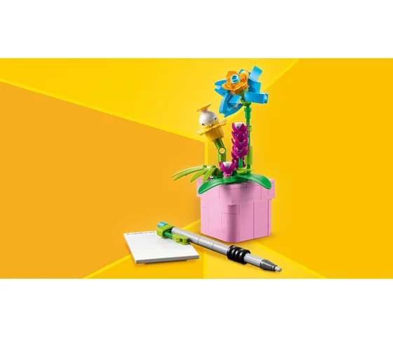 LEGO fans hebben de keuze uit 3 verschillende bloemensets om te bouwen: een typemachine met bloemen, een keytar speelgoedinstrument op een standaard met bloemen of een bloempot met een pen en notitieboekje. De speelset bevat ook 3 stickers met mooie zinnen die kinderen kunnen gebruiken hun modellen te versieren.